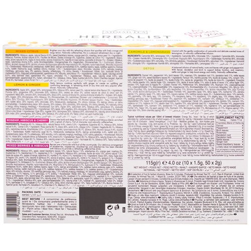 Ürditeede kollektsioon. 100% naturaalsed puvilja ja ürditeed ilma kofeiinita. 6 erinevat maitset - tsitruseliste segu, kibuvits kirsiga, tee-punapõõsas kaneeliga, kummel sidrunheinaga, marjade assortii, piparmünt sidruniga. Niitidega teepakikesed fooliumist pakendis võimaldavad säilitada tee aroomi ja maitset. Teel on vaja lasta tõmmata umbes 3-5 minutit.